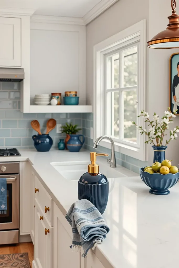 My counter styling begins with two or three bold items made from the chosen color including a ceramic utensil holder and a fruit bowl and a linen towel. I continue by selecting additional items which include matching soap dispenser alongside a small tray for rings and keys together with a ceramic vase for flowers. White quartz and light wood backgrounds serve as excellent bases because they allow the accent color to become more prominent. The essential principle in this process is maintaining consistency which leads me to exclude random colorful items that do not fit within the chosen theme.