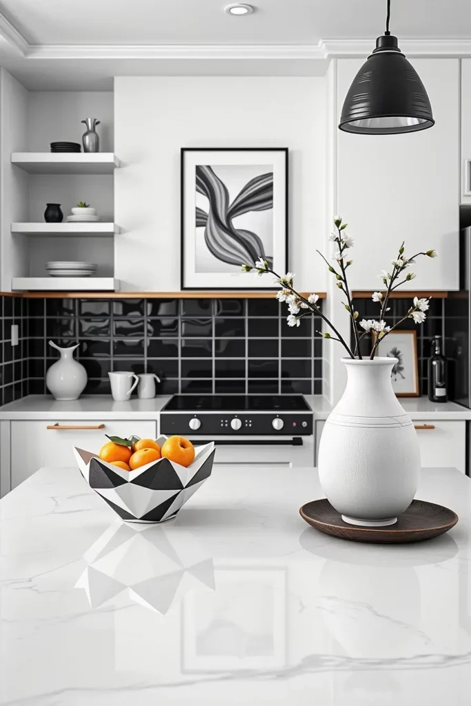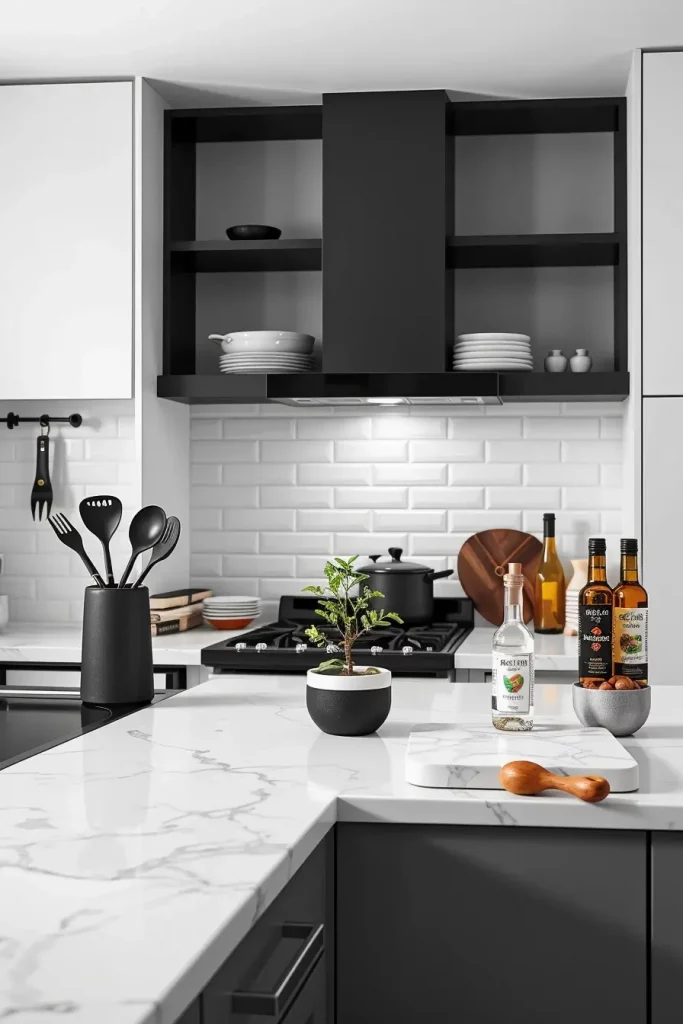 The styling of black and white kitchen counters requires deliberate planning because these surfaces tend to appear either too empty or too full of items unless properly arranged. The symmetrical and minimalistic approach guides me while working with this color palette. The visual goal aims to achieve a clean appearance while using matte ceramics and metal finishes and soft linens to introduce dimensional elements. A black-and-white aesthetic works well with Scandinavian or transitional kitchen interiors.