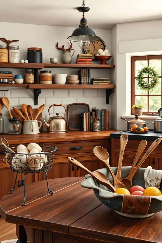 The essential items I use for counter styling are wooden cutting boards together with a copper tea kettle and ceramic jars with wooden lids and a wire egg basket. I show wooden spoons inside a stoneware jug while placing vintage recipe books open on a wooden stand. The dough bowl functions as both decorative piece and useful storage by holding apples or garlic bulbs.