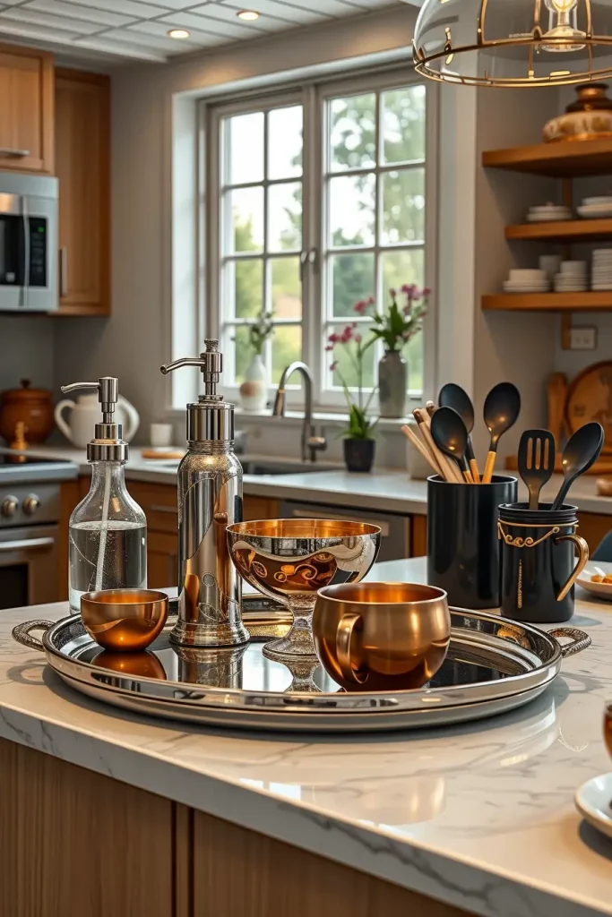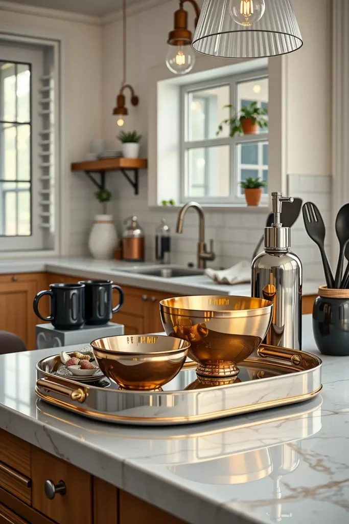 Metallic elements serve as quick kitchen transformation tools which provide both sheen and refined appearance. I regularly add metallic elements to kitchen counters because they produce an elegant yet affordable aesthetic. The choice of anchor tone depends on kitchen style where I select either brushed brass or matte black or polished chrome.