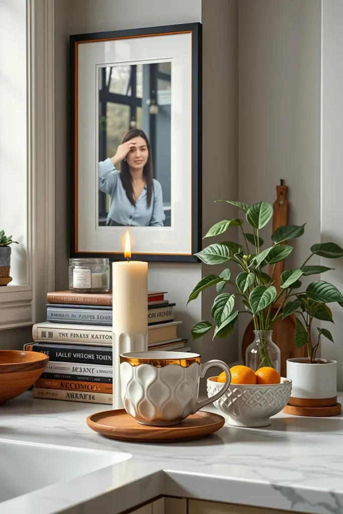 I choose between five to six decorative items that showcase the homeowner’s personality through a combination of cookbooks, a candle, citrus fruit display, picture frame, ceramic mug and a houseplant. The objects get arranged into separate clusters while maintaining enough space between each one. Always follow this rule: keep 30% of the counter area free for functional purposes.