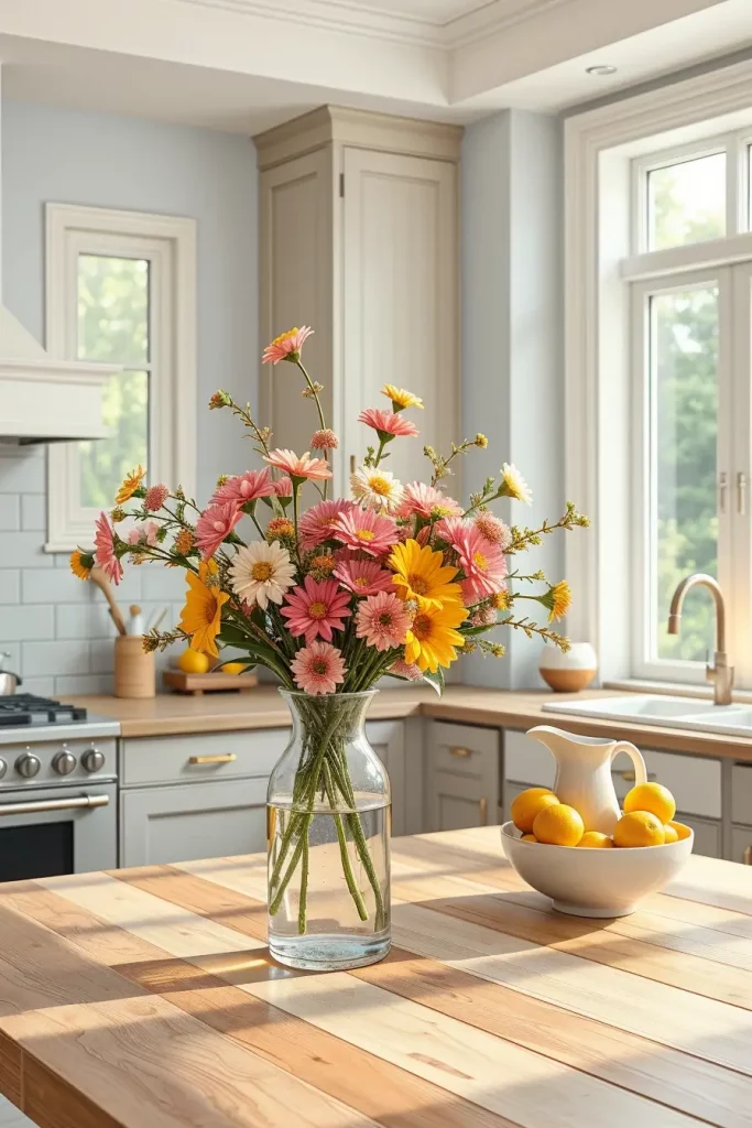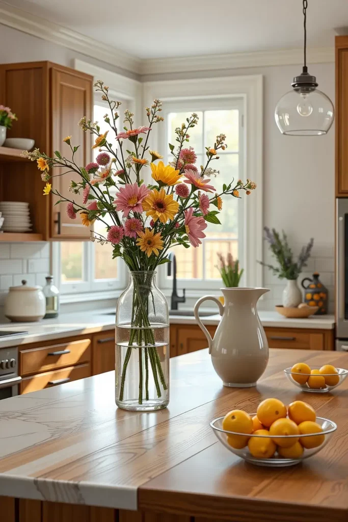 I always arrange flowers in a tall glass vase that I position next to the sink or countertop corner. The arrangement pairs best with either a small lemon bowl or a basic wooden tray to establish natural foundation. The floral arrangement creates vertical movement that rounds off the harsh lines of kitchen furniture and appliances. The usage of elaborate vases in modern kitchens should be avoided because they break the design’s smooth flow.
