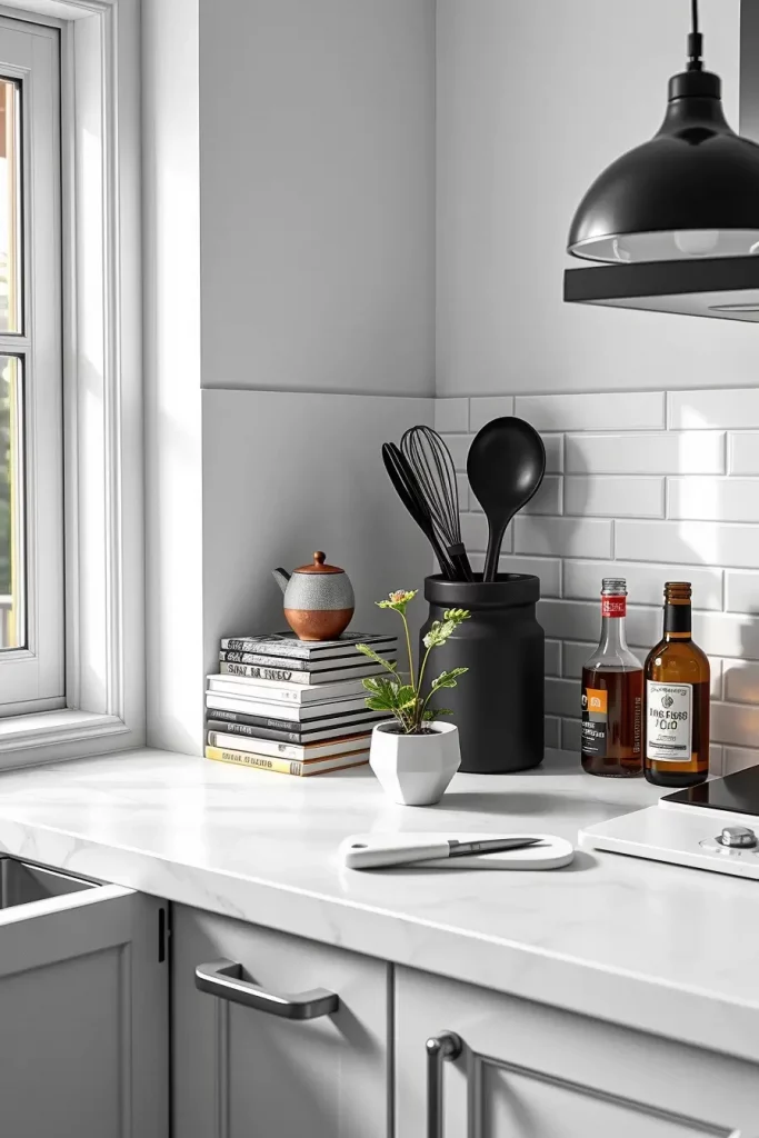 I balance the countertop by placing stacked cookbooks with neutral covers and a matte black utensil holder and a small white potted plant on one side. The sophisticated touch of the marble board and glass oil bottles appears on the opposite side of the counter. The use of pure black and soft white and muted gray accessories creates unity and improves design appearance while preventing overcrowding of the room.