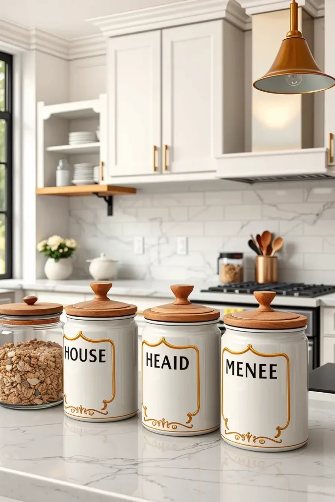 Most kitchen counters feature a uniform row of jars which should have matching labels or wooden lids. The jars serve both functional and aesthetic purposes while maintaining their practicality. My selection of white ceramic canisters with gold decorative elements services elegant kitchen designs while rustic clay jars work best in farmhouse interiors.