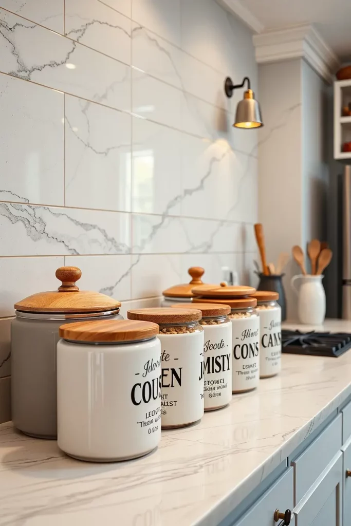 Decorative canisters represent an ideal combination of functionality and visual appeal according to my personal preference. These storage containers serve both functional purposes as dry food containers and decorative kitchen elements. Clear glass together with ceramic or labeled metal containers provide both style and counter organization.