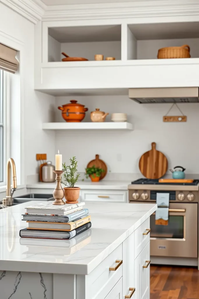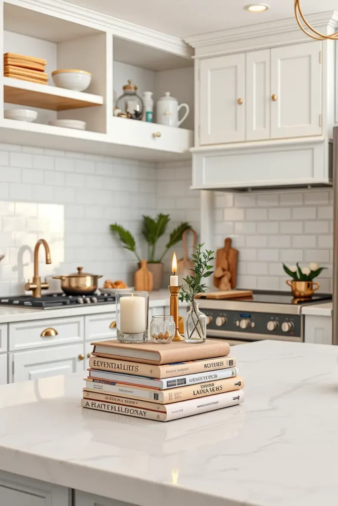 I arrange two to three hardcover cookbooks in a countertop corner with their neutral or matching spine colors that harmonize with other space elements. I put candles and small plants together with decorative items such as salt cellars on top of the stack. The cookbook stand with an open featured page serves as a vertical element that I position near the cooking area.