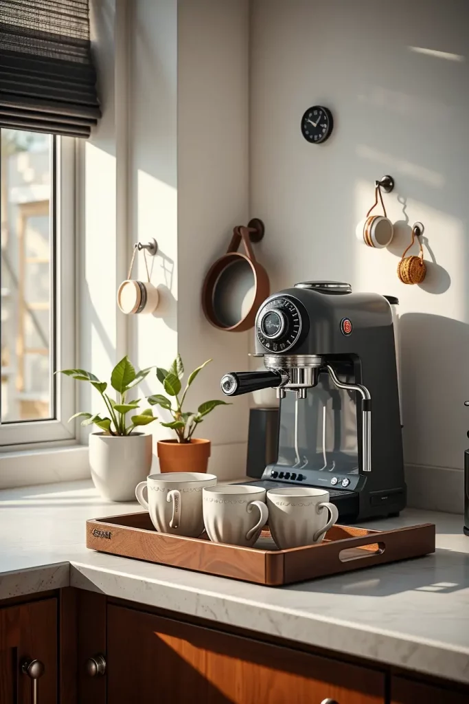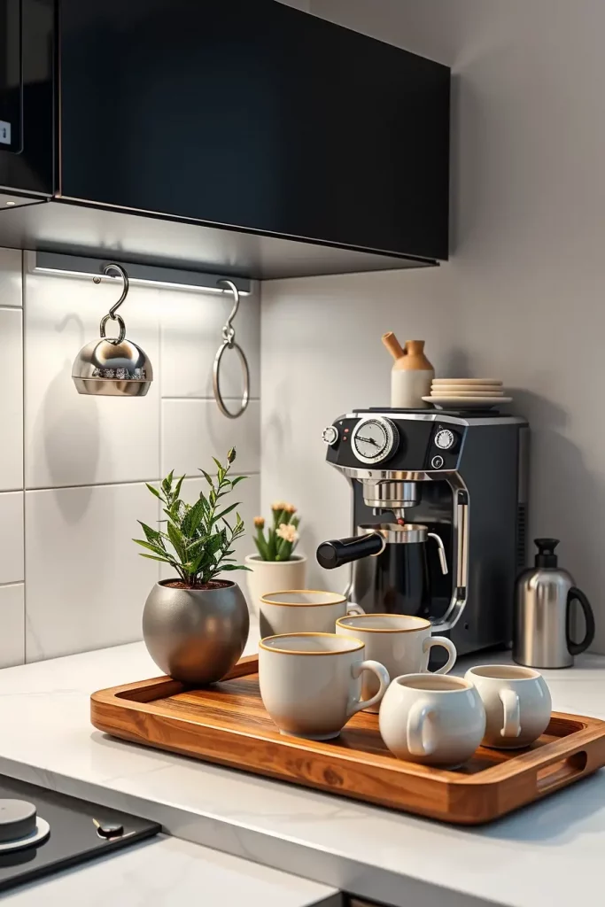 I begin with a small espresso machine or drip coffee maker followed by matching sugar bowl and creamer jug and a small tray containing favorite mugs. The space I work with either includes a small shelf or vertical hook arrangements for cup storage. A wooden stirrer placed inside a ceramic jar together with a small plant or candle creates the finishing touch of the vignette. The design presents an attractive and neat appearance.