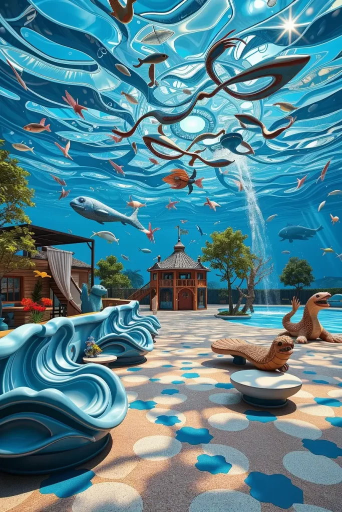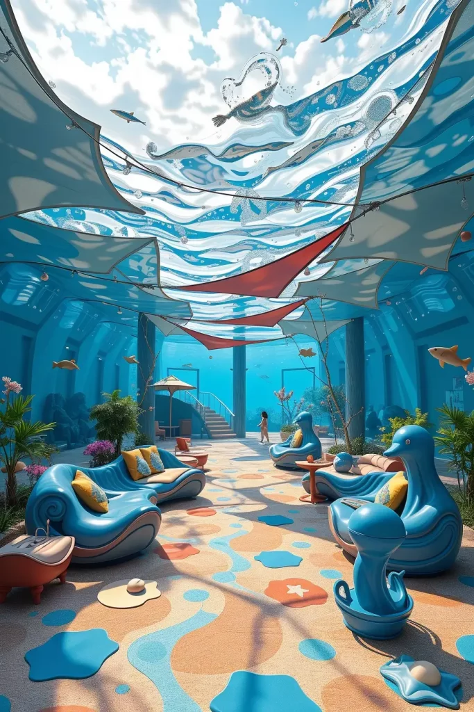 In these spaces, I include wave-shaped seating, sculptural play elements resembling sea creatures, non-slip flooring with aquatic patterns, and shaded canopies that diffuse light. Each item contributes to the theme while prioritizing safety and durability.