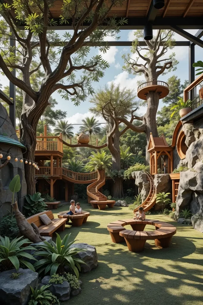 I typically include sculptural climbing frames shaped like trees, rope bridges, carved seating resembling rocks, and artistic wall panels with jungle motifs. Each element has a functional purpose: climbing structures build strength, rope elements improve coordination, and artistic panels stimulate imagination. I always prioritize durable, weather-resistant materials that feel natural to the touch.