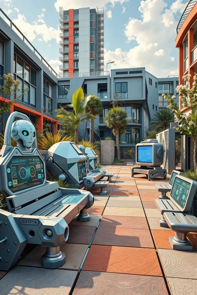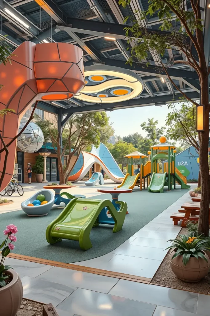 Robot and AI inspired outdoor play spaces reflect how technology influences childhood imagination in 2026. I design these areas to feel innovative while remaining grounded in physical play, ensuring children stay active rather than passive.
