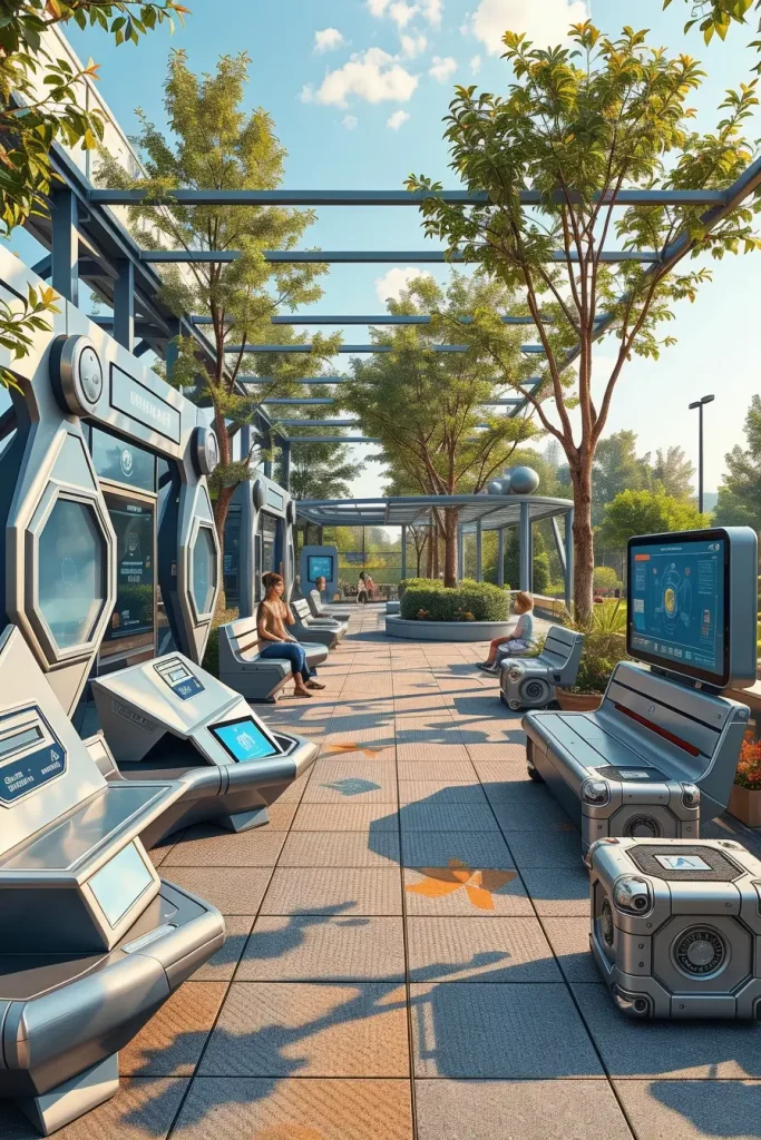 What I would add to this section is subtle integrated lighting powered by solar panels, which enhances evening usability and reinforces the futuristic theme while remaining energy efficient.