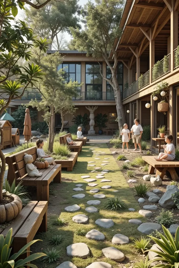I include natural wood seating, sculptural fantasy elements, gentle pathways, and planted borders. Each item serves to blend the environment seamlessly, encouraging children to move between real and imagined worlds without visual disruption.