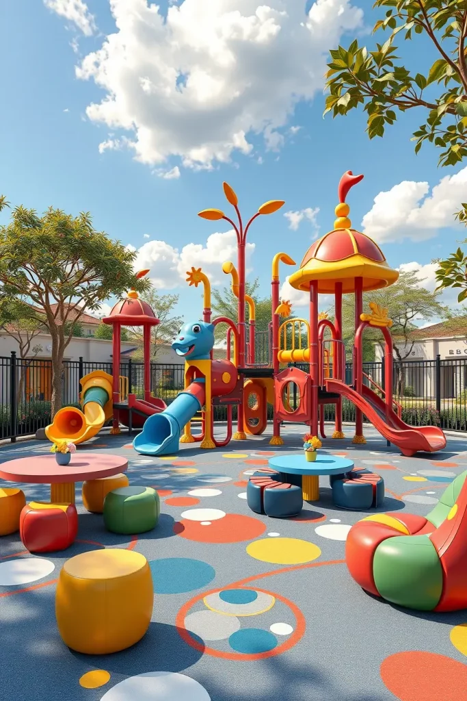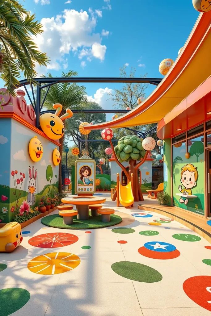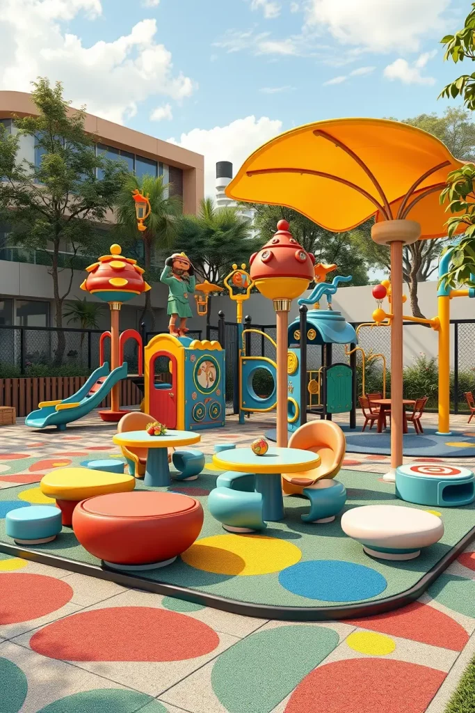 In my layouts, I use brightly colored play structures, rounded outdoor furniture, graphic floor patterns, and durable plastic-coated surfaces. Each piece is selected to reinforce the cartoon aesthetic while remaining easy to clean and maintain. Furniture is scaled specifically for children to promote comfort and independence.