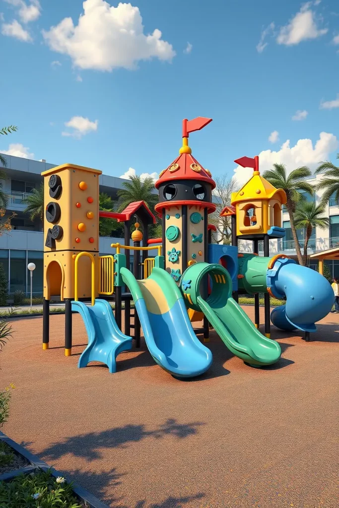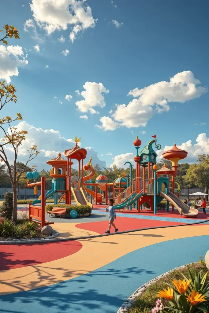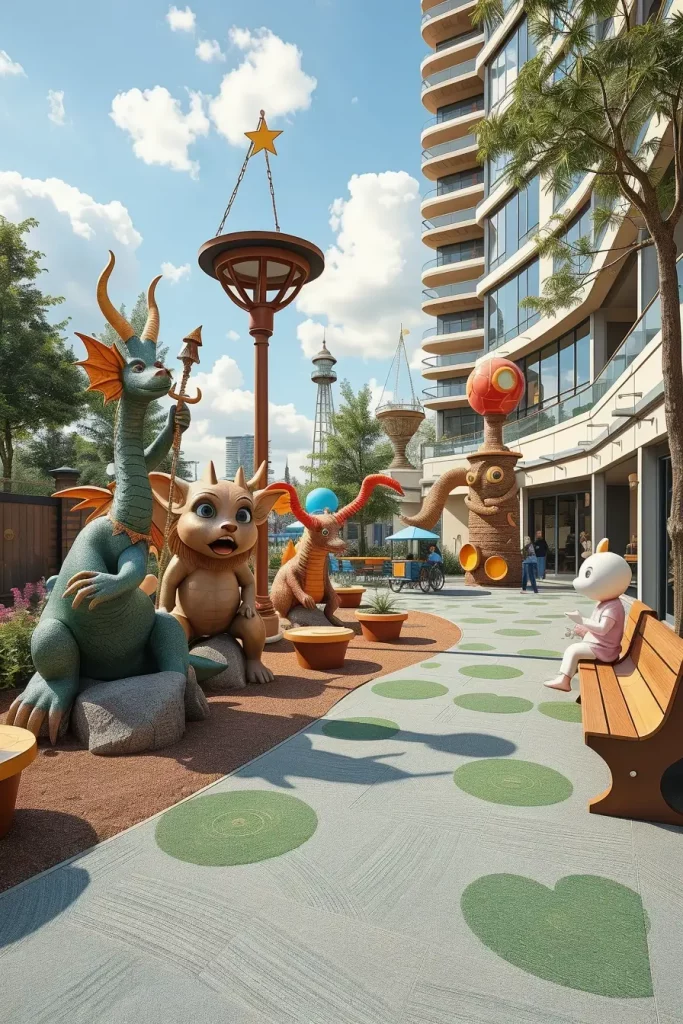 Artistic playground designs treat play structures as functional art. I approach these spaces as outdoor galleries where children can climb, sit, and interact with sculptural forms. The layout must balance visual impact with clear circulation paths.