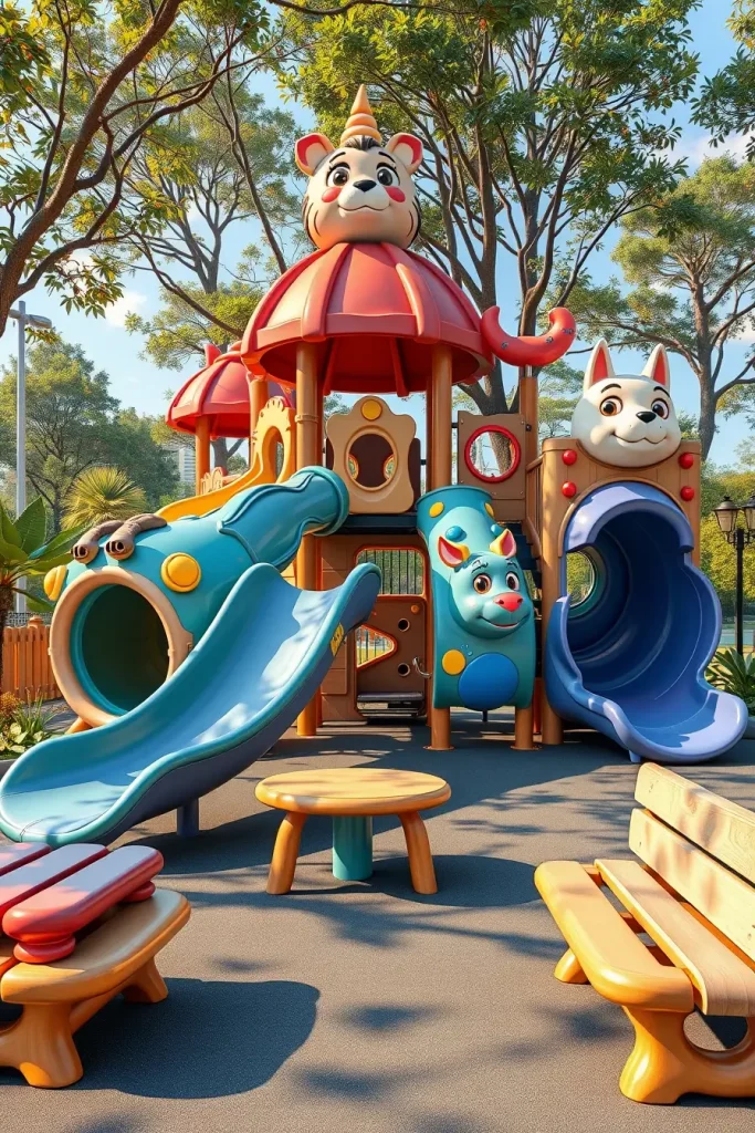 Animated animal-themed outdoor spaces bring storytelling directly into the landscape, and I find them especially effective for younger children. These areas use friendly animal forms integrated into slides, tunnels, and climbing structures, creating an immersive environment that feels playful yet structured. The goal is to blend fun visuals with safe, intuitive movement paths.