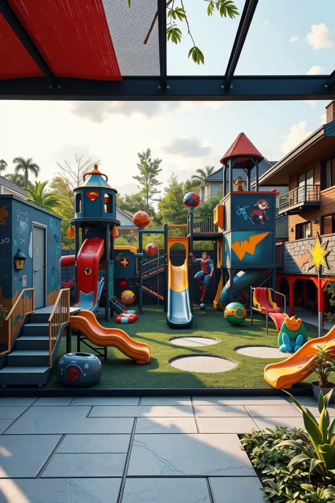Superhero-inspired outdoor areas are designed for movement, strength, and confidence building. I view these spaces as outdoor training grounds that combine physical challenges with imaginative themes. Clear zones for climbing, jumping, and balancing help children understand how to use the space safely and effectively.