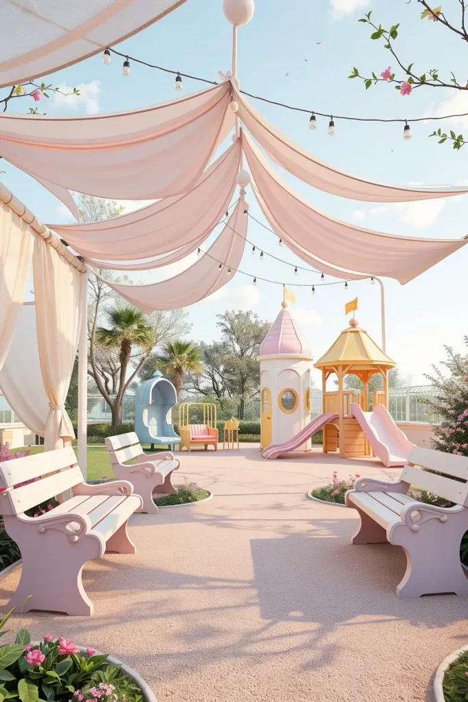 Dreamy pastel outdoor areas focus on calm fantasy rather than high-energy play. I design these spaces for children who enjoy imaginative, quiet, and social play. Soft color palettes and gentle forms help create a soothing environment that still feels special.