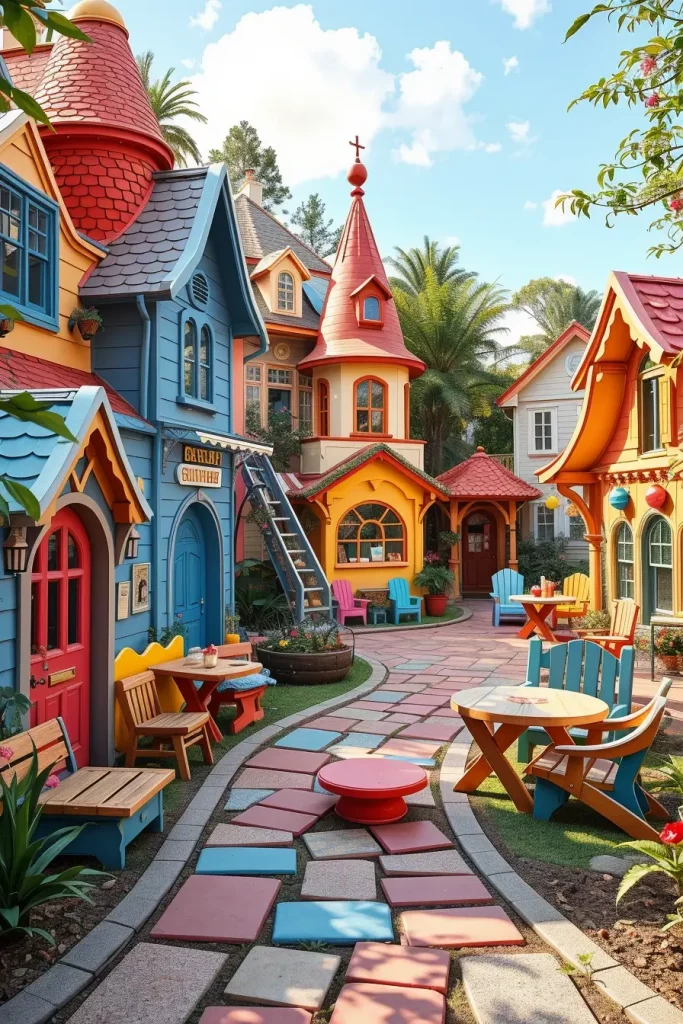 I design colorful fantasy villages as miniature worlds where children can move freely between zones that feel like small streets, homes, and gathering areas. These outdoor areas are practical because they organize play into recognizable environments while still allowing open-ended imagination. I focus on layouts that promote safe circulation, clear sightlines, and flexible use for both solo and group play.