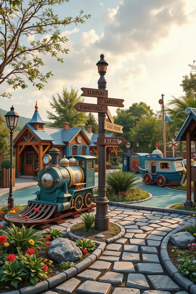 Fairytale travel-themed outdoor areas allow children to imagine journeys across magical destinations. I design these spaces as a series of connected zones, each representing a different place, while keeping the layout intuitive and safe. This structure supports exploration without confusion.