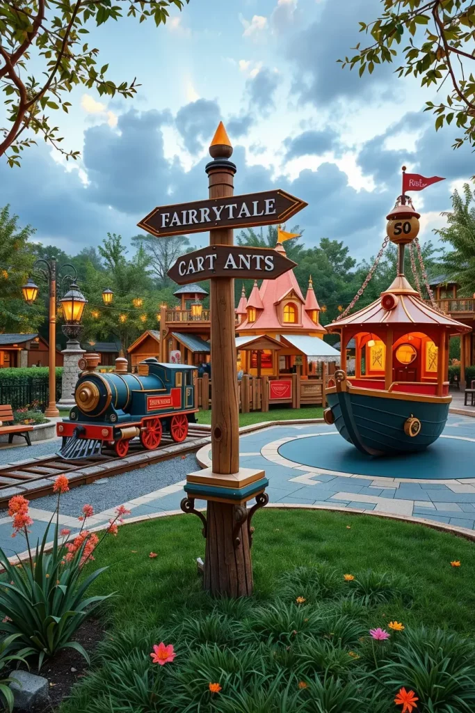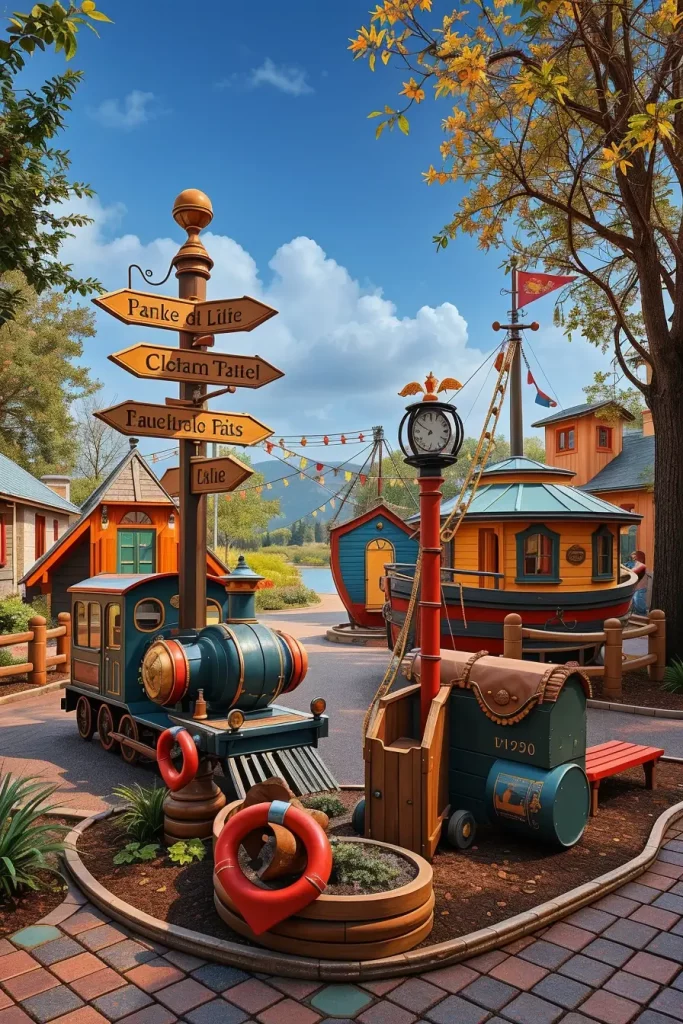 Elements often include train-shaped seating, boat-inspired platforms, whimsical signposts, and themed playhouses. Flooring patterns can suggest roads or paths, guiding movement naturally. All furniture remains child-scaled and constructed from durable outdoor materials.