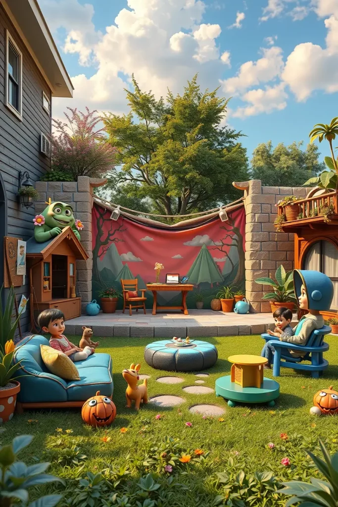 Animated movie style backyards allow me to recreate cinematic environments that feel familiar and exciting to children. These spaces are organized around storytelling zones that encourage reenactment and collaborative play, which is especially valuable for social development.