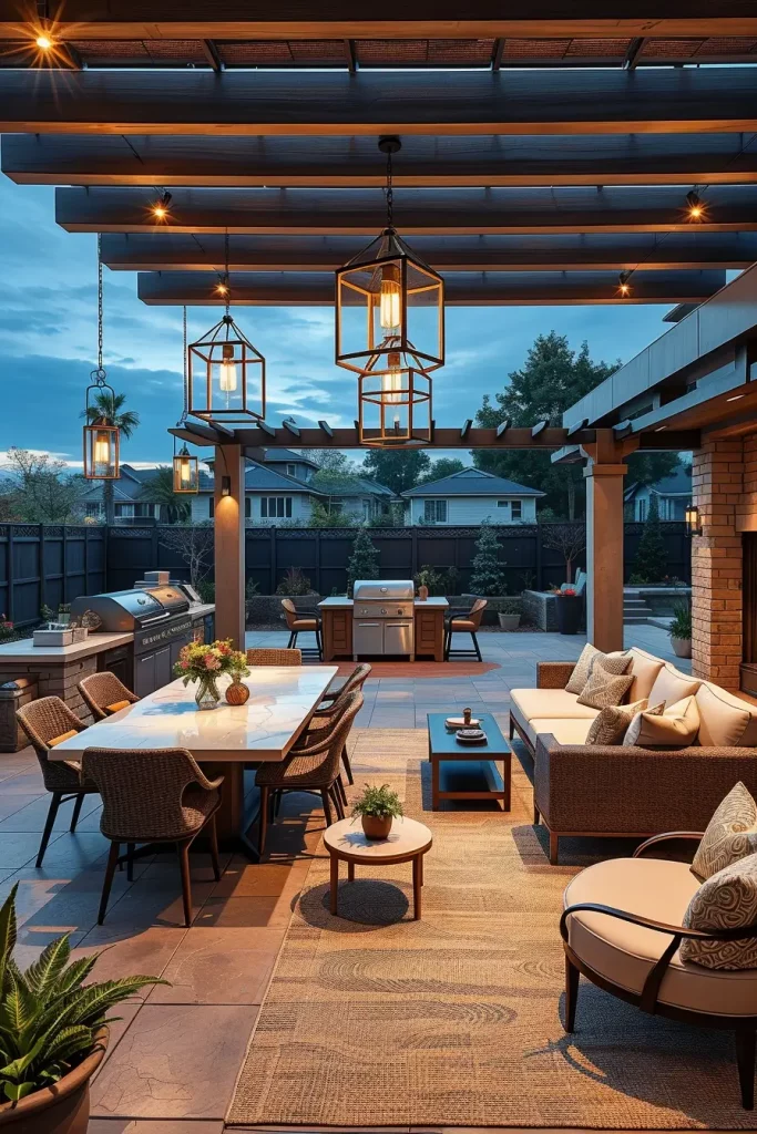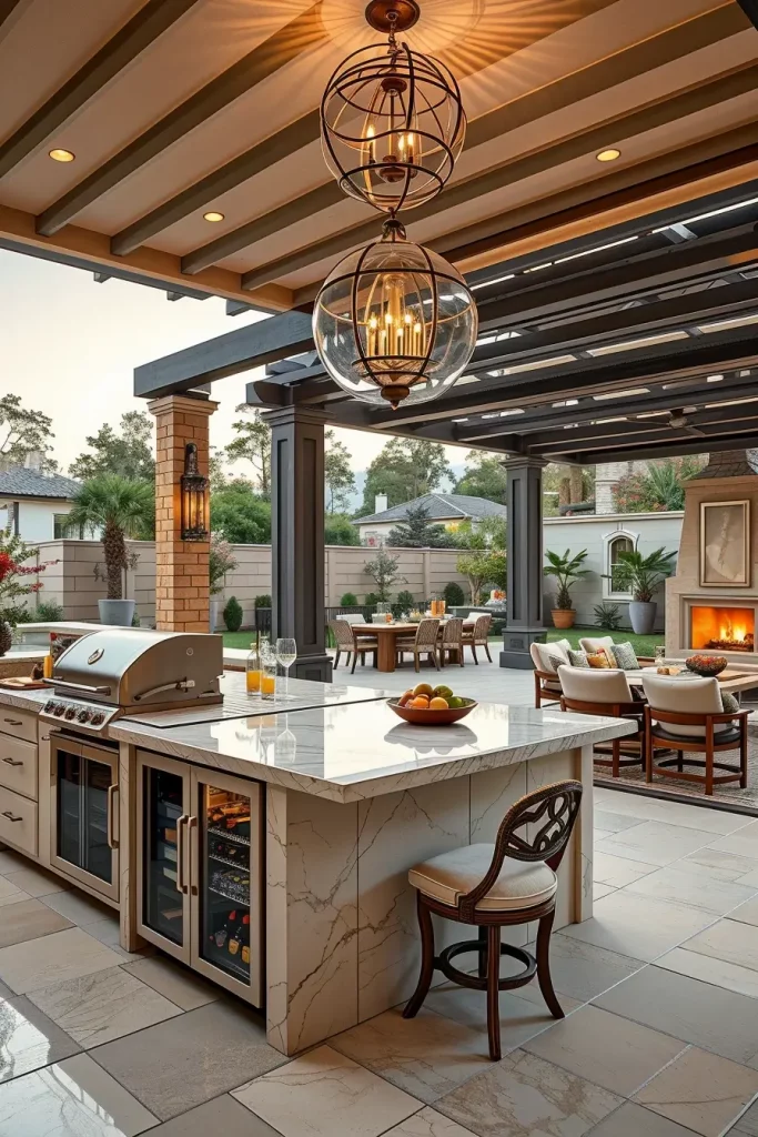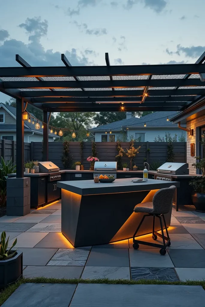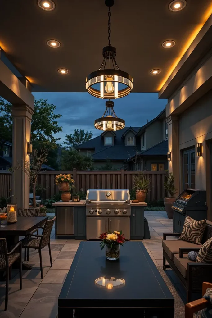Lighting has become one of the most impactful elements in outdoor grill area ideas 2026, transforming functional spaces into visually striking evening environments. When I design grill areas with statement lighting, I treat illumination as both a safety feature and a design focal point. The layout includes defined cooking, dining, and lounge zones, each enhanced through intentional lighting layers.