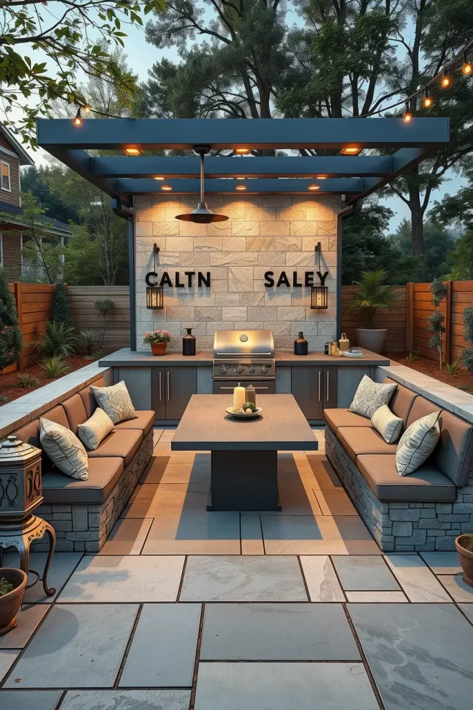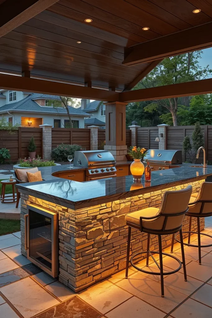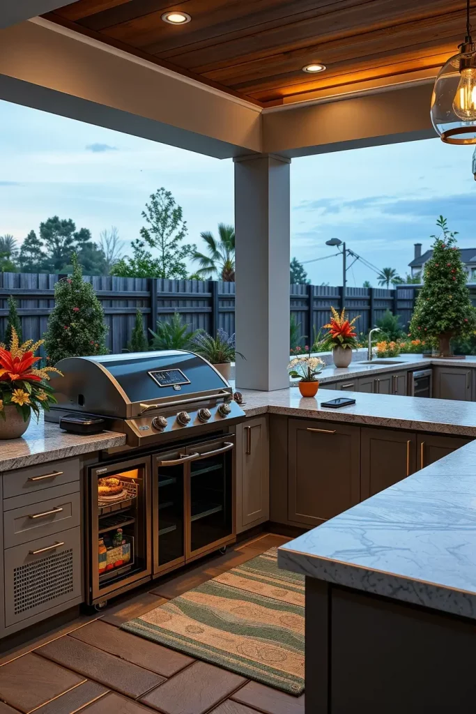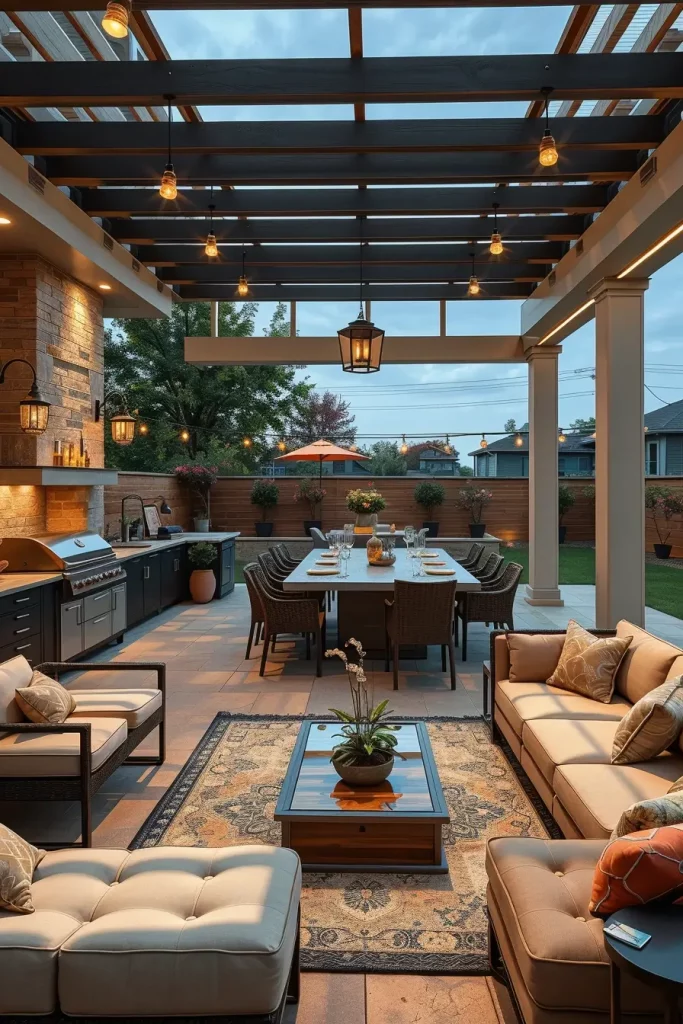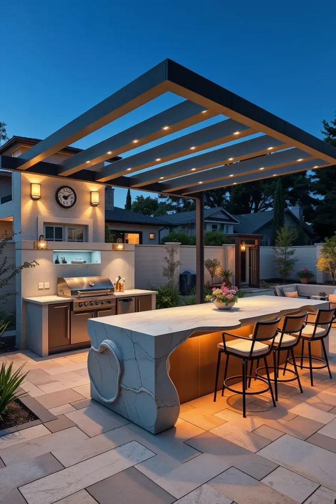 Lighting has become one of the most impactful elements in outdoor grill area ideas 2026, transforming functional spaces into visually striking evening environments. When I design grill areas with statement lighting, I treat illumination as both a safety feature and a design focal point. The layout includes defined cooking, dining, and lounge zones, each enhanced through intentional lighting layers.