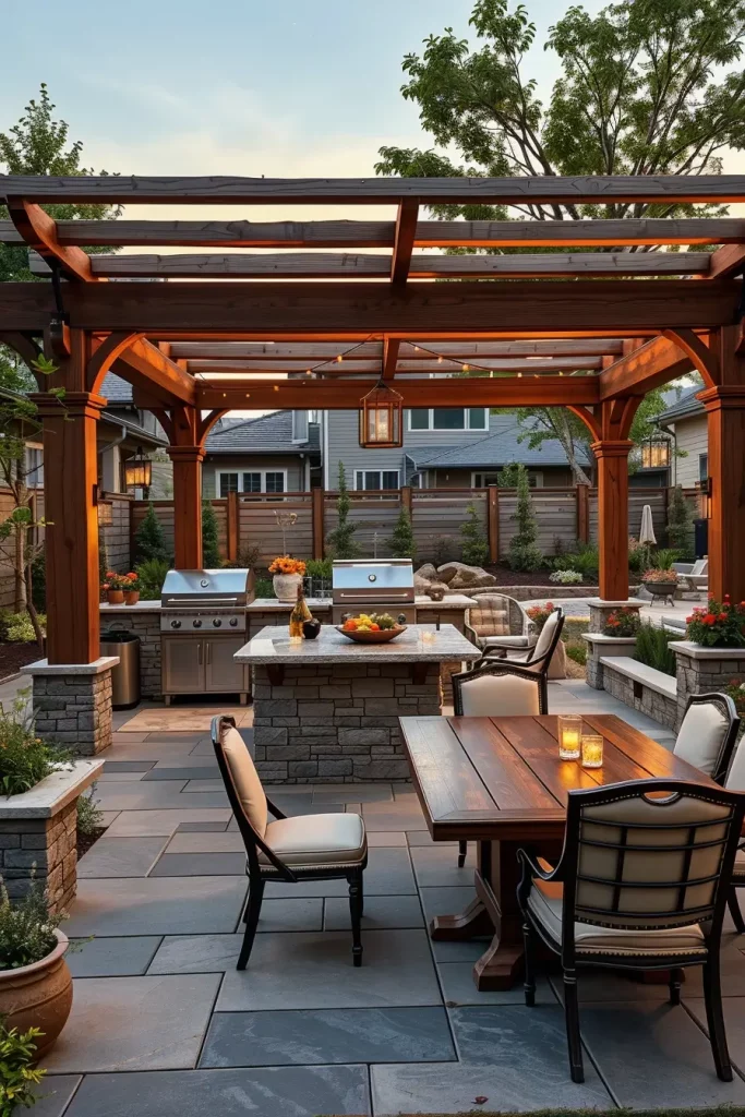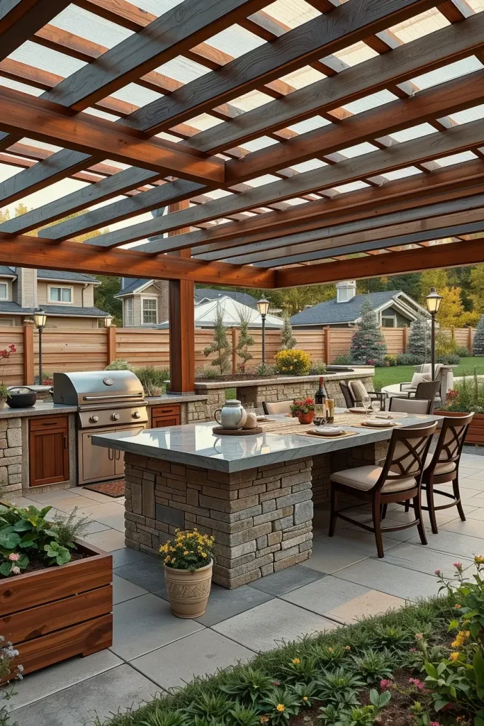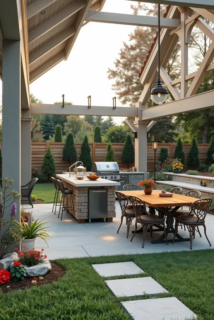 A pergola instantly defines a grill area and gives it architectural presence. In my projects for 2026, I use pergolas not only for shade but also as structural design statements. I carefully align the pergola with the grill station and seating layout so the entire area feels cohesive. Whether attached to the house or freestanding, the pergola becomes the visual frame of the outdoor cooking zone.
