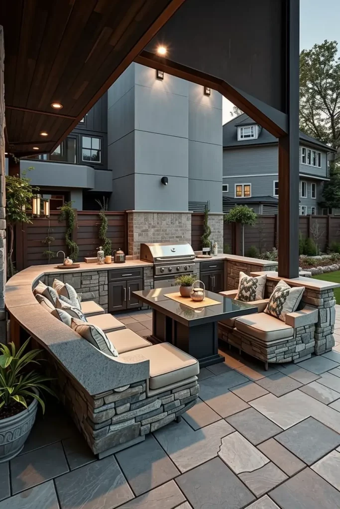 I usually construct seating from the same material as the grill island base, whether stone, concrete, or composite panels, to create a unified look. I add thick outdoor cushions in performance fabrics that resist moisture and fading. Hidden storage compartments beneath the benches are especially practical for storing grilling tools, blankets, or outdoor dinnerware. A central dining table or fire feature can be integrated to encourage conversation.