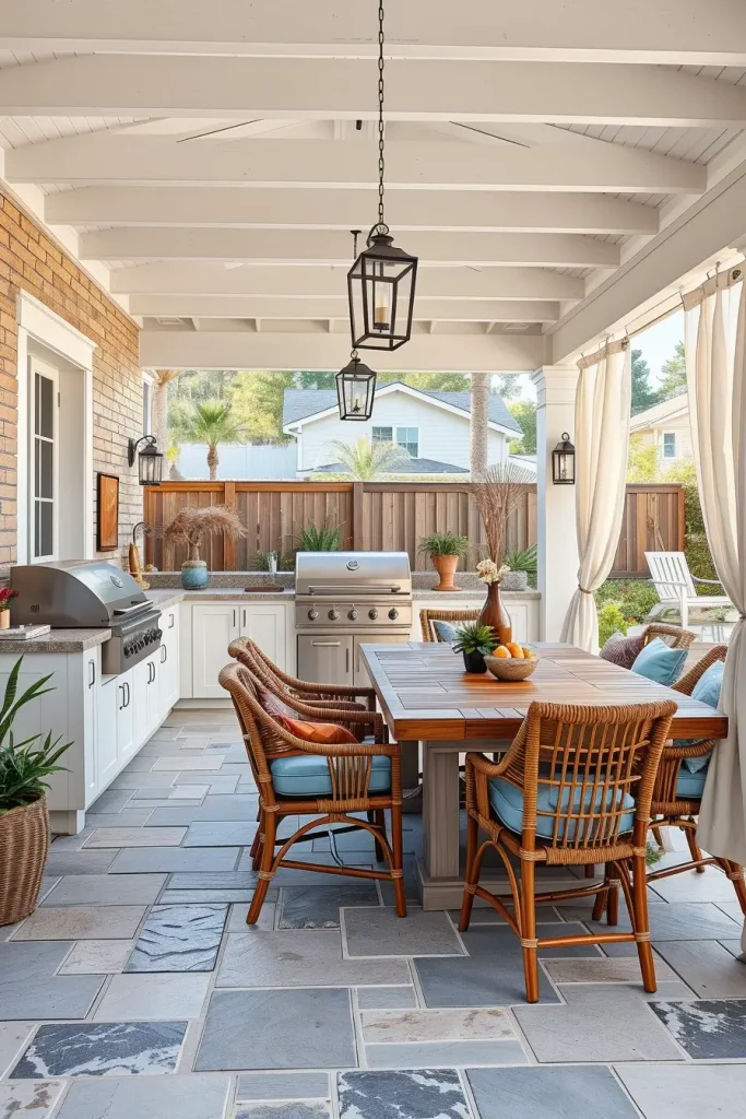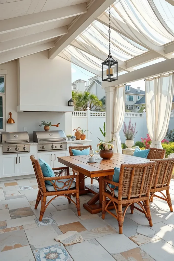In these spaces, I favor light stone or porcelain surfaces, white or sandy-toned cabinetry, and brushed stainless-steel grill finishes. Woven outdoor dining chairs, a solid wood table in a light finish, and subtle blue or soft gray cushions enhance the breezy mood. Sheer outdoor curtains under a pergola add movement and soften the structure. Decorative elements remain restrained: lanterns, simple ceramic planters, and textured outdoor fabrics complete the composition without cluttering it.