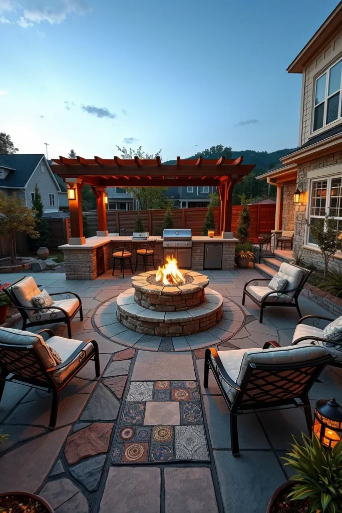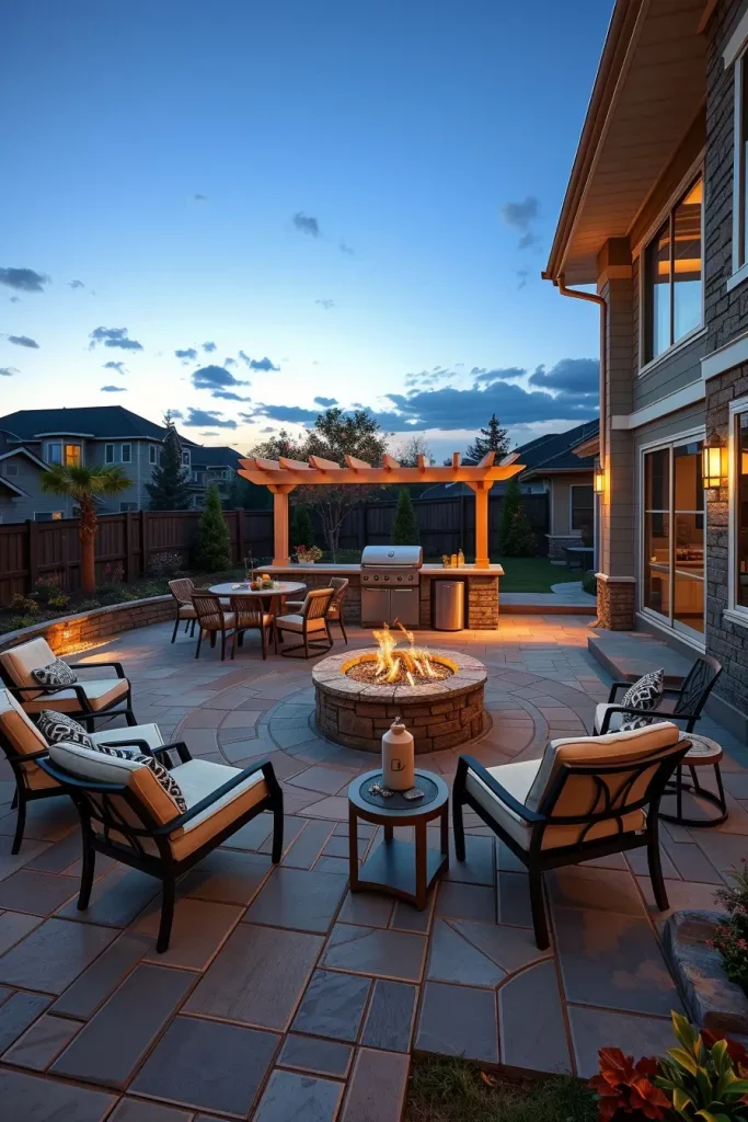 What I always add to this concept is proper circulation planning. Guests should be able to move comfortably between the grill, dining area, and fire pit without crossing through high-heat zones. Careful spacing transforms a visually appealing idea into a practical and safe one.
