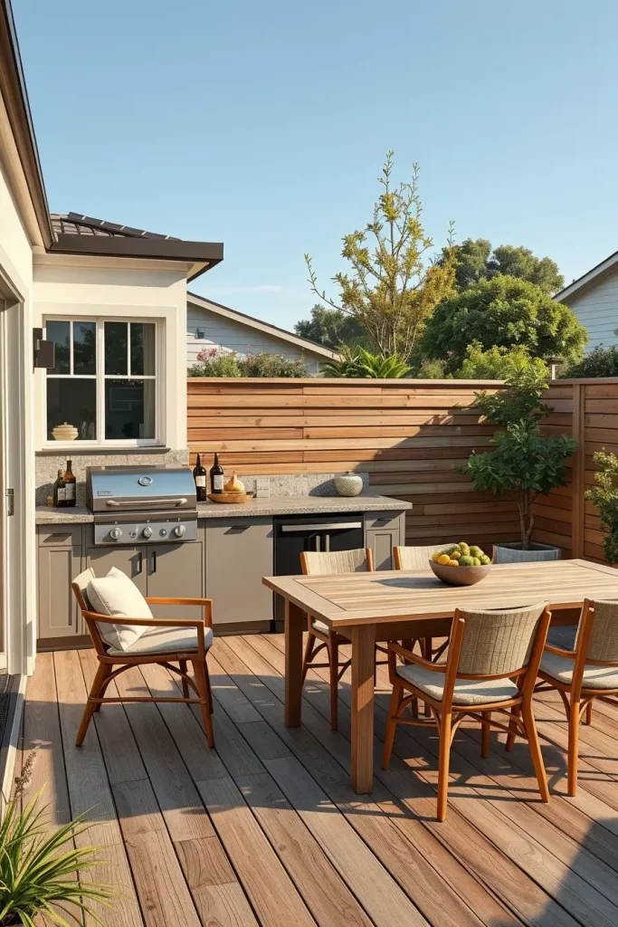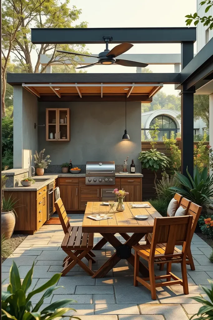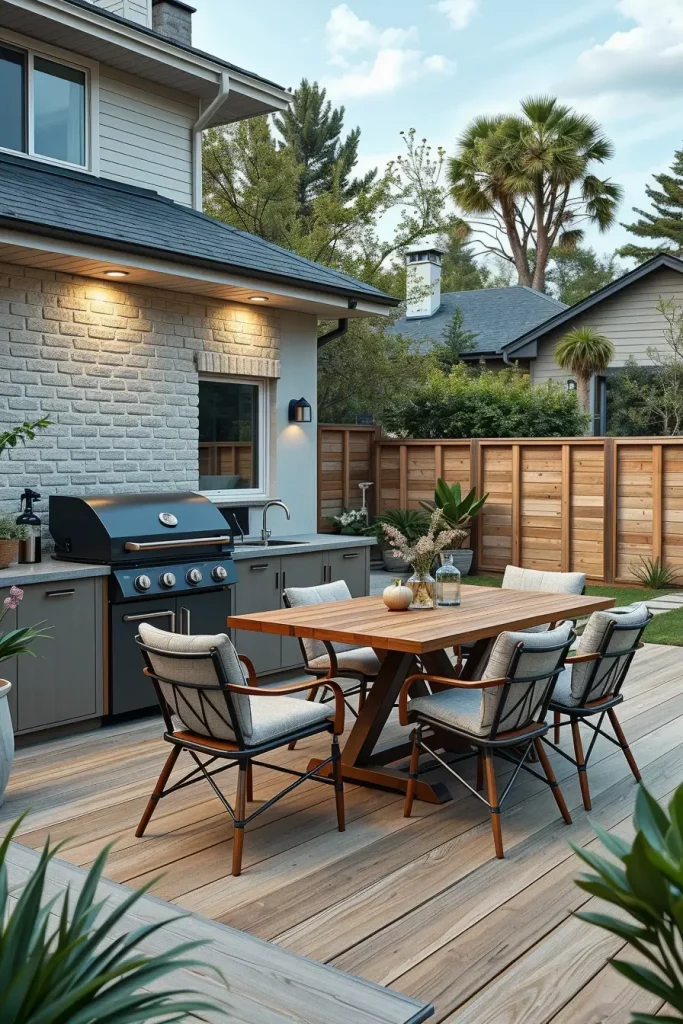 I prefer natural stone countertops, weathered wood accents, and integrated planting beds surrounding the grill zone. Dining tables made from durable hardwood or powder-coated metal maintain structure without overpowering the landscape. Strategic planting, such as ornamental shrubs or vertical green walls, frames the grill area while maintaining ventilation and safety clearances.