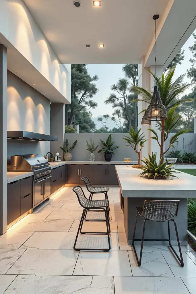 What is often missing in this concept is layered outdoor lighting. I recommend adding recessed floor lights along pathways and subtle LED strips under countertops to enhance depth during evening gatherings without breaking the minimalist aesthetic.