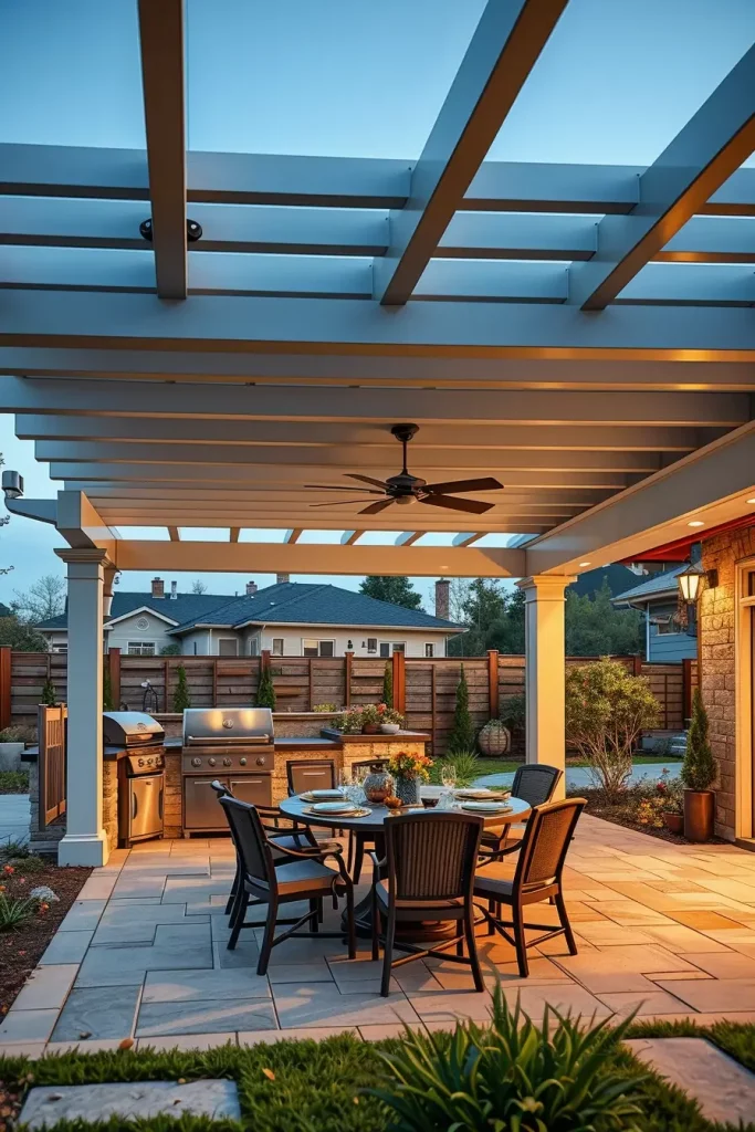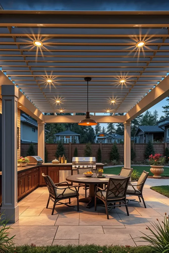 I often select powder-coated aluminum pergolas for durability and minimal maintenance. Integrated slatted roofs or adjustable louvers provide flexible sun control. I add ceiling-mounted heaters, recessed lighting, and even outdoor speakers within the structure. Draped weather-resistant curtains soften the lines and add privacy. A cohesive color palette between the pergola frame, grill station, and furniture ensures a harmonious look.