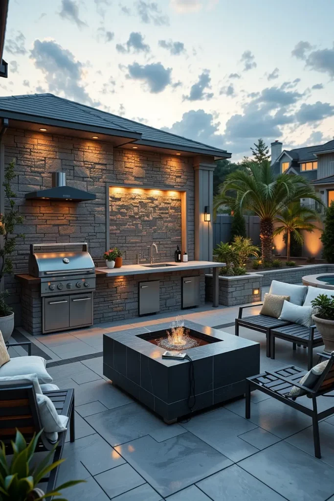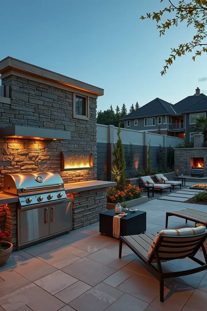 Combining a grill station with a fire pit is one of the most stylish and socially engaging directions for 2026. I design these spaces so that cooking and gathering occur within the same visual axis but remain safely separated. The fire feature becomes a secondary focal point that extends the usability of the grill area well into cooler evenings.
