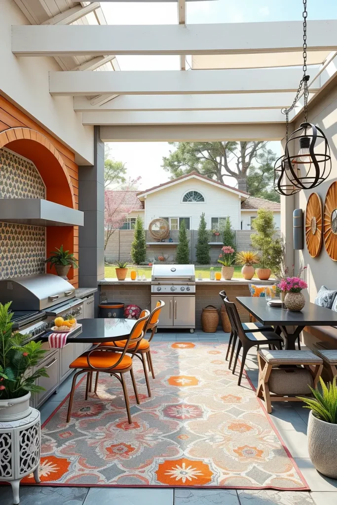 I often incorporate patterned ceramic tile backsplashes behind the grill, painted accent walls in weather-resistant finishes, and bold outdoor rugs that define the dining area. Powder-coated metal chairs in saturated hues pair beautifully with a sleek stainless steel grill. I also recommend sculptural lighting fixtures or artistic pendant lamps rated for outdoor use. Decorative cushions, ceramic stools, and textured planters reinforce the artistic atmosphere without overcrowding the layout.