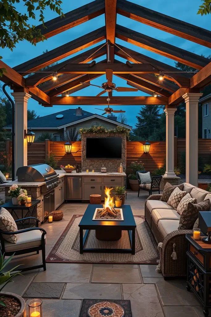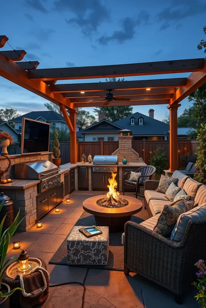 When the goal is entertainment, I design the grill area as a multi-functional outdoor lounge. In 2026, these stylish outdoor grill area ideas 2026 extend beyond cooking to include media, music, and flexible seating zones. I carefully divide the backyard into activity areas while keeping visual cohesion throughout.