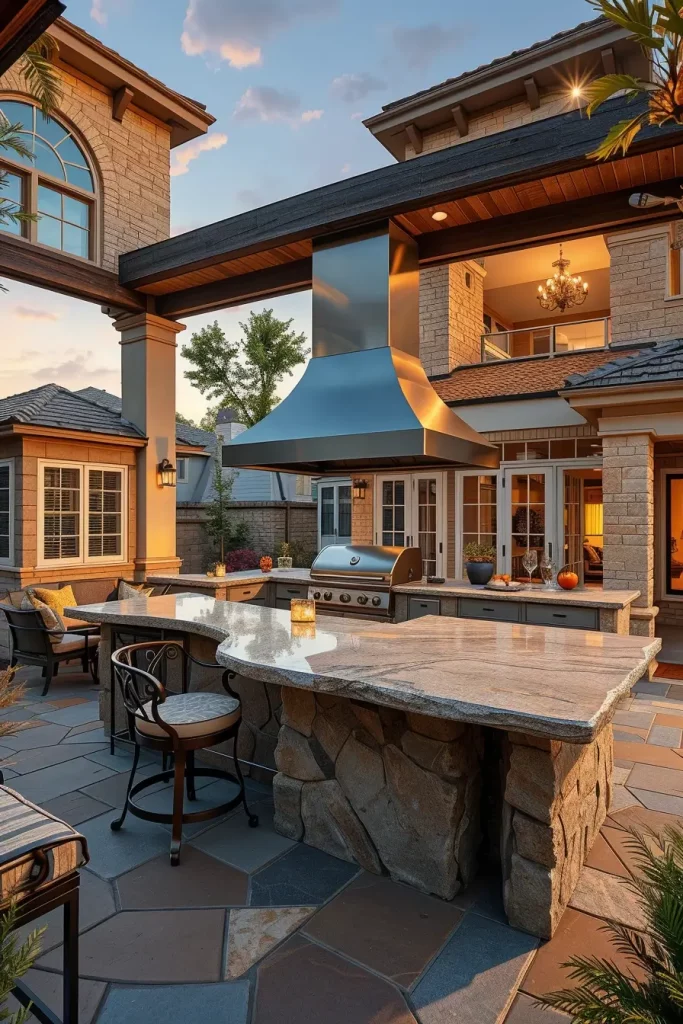 I often incorporate oversized natural stone slabs, custom metalwork, and sculptural chimney hoods above the grill. Seating may include custom-built lounge platforms with premium outdoor fabrics. Integrated landscape lighting highlights architectural textures and pathways. A cohesive material palette ties the grill structure to the house façade, ensuring harmony rather than contrast.