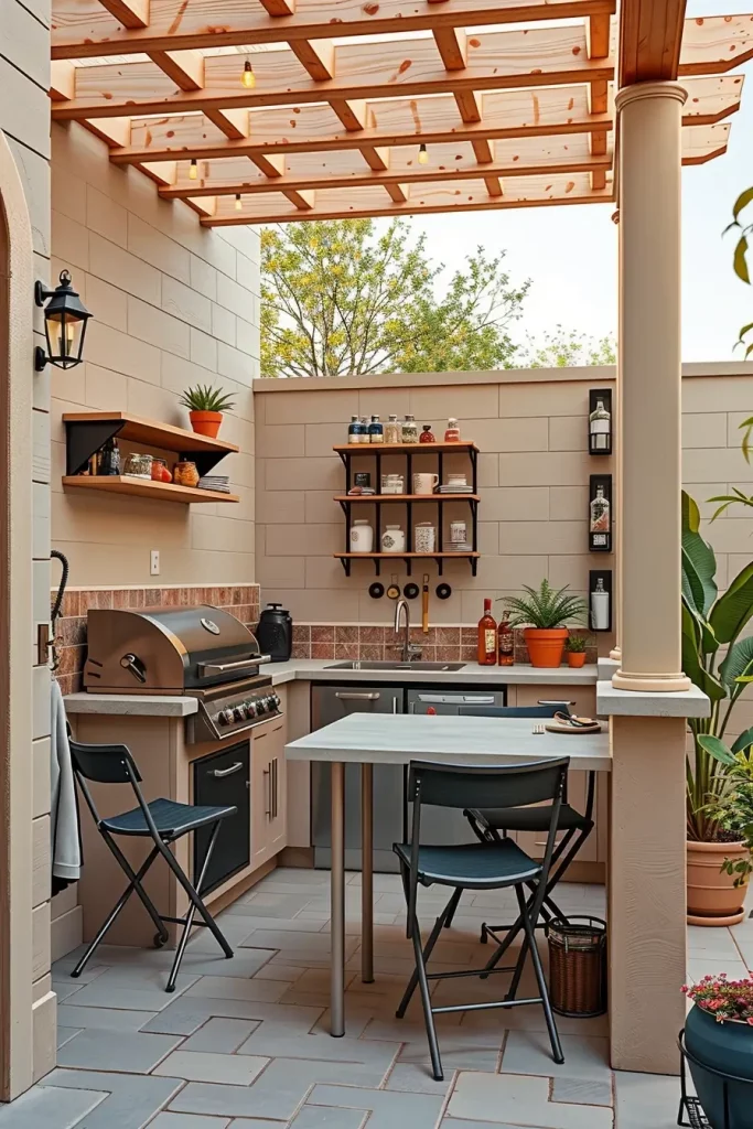 I often use slim-profile built-in grills combined with narrow countertops that still allow sufficient prep space. Foldable dining tables, stackable chairs, and built-in bench seating along perimeter walls help free up central floor space. I prefer light-toned stone pavers and reflective finishes that visually expand the area. Wall-mounted herb planters and slim shelving units add greenery without sacrificing circulation. Storage must be integrated under seating or within the grill base to avoid clutter.