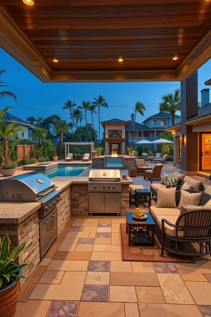 I usually incorporate a premium built-in grill with rotisserie features, a beverage fridge, a wine cooler, and custom cabinetry in weather-resistant finishes. Upholstered outdoor sofas with performance fabrics, a large dining table for hosting, and sculptural pendant lighting above the island add elegance. Decorative elements such as outdoor rugs, textured cushions, and statement fire features enhance comfort while maintaining sophistication.