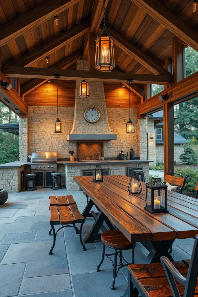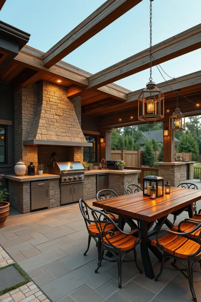 I usually incorporate a stone-clad grill island, wooden ceiling beams, concrete countertops, and metal-framed seating. A large wooden dining table becomes the centerpiece, surrounded by durable yet comfortable chairs. I add layered lighting through lantern-style fixtures and integrated LED strips to maintain functionality while preserving atmosphere.