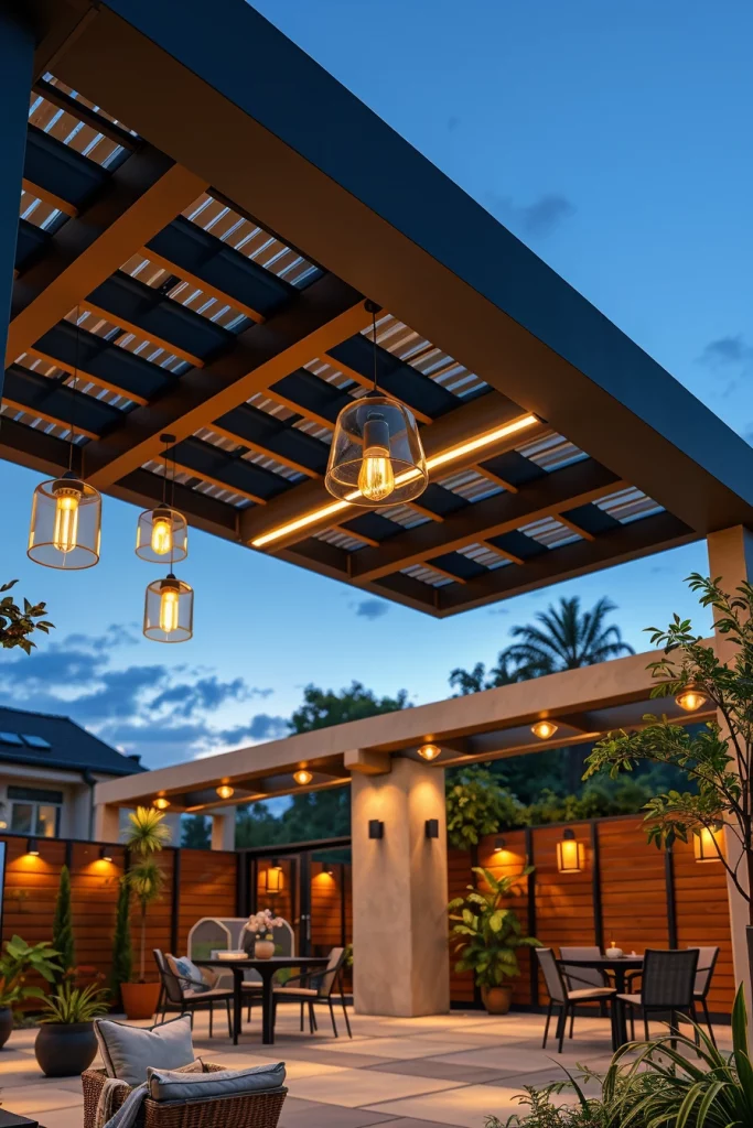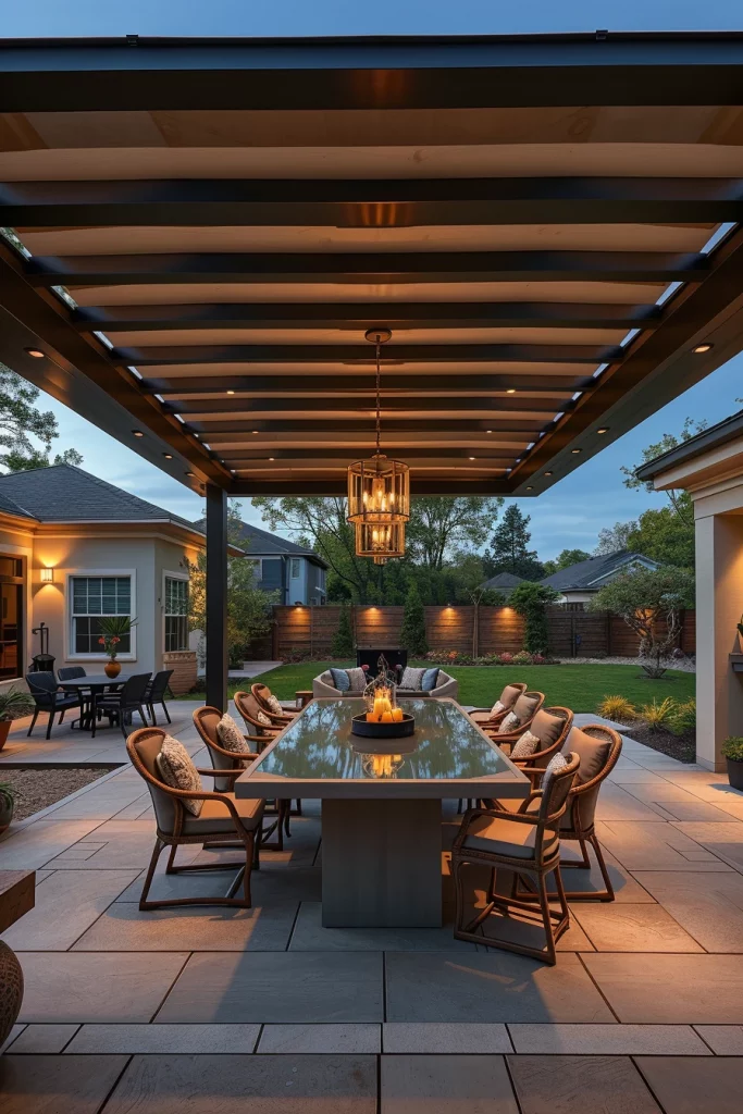 For furniture, I pair metal pergolas with weather-resistant upholstered seating, minimalist dining sets, and sculptural outdoor chairs. Powder-coated aluminum or steel frames work well with neutral textiles and concrete or stone flooring. Integrated lighting systems mounted directly into metal beams maintain a clean, uninterrupted look.