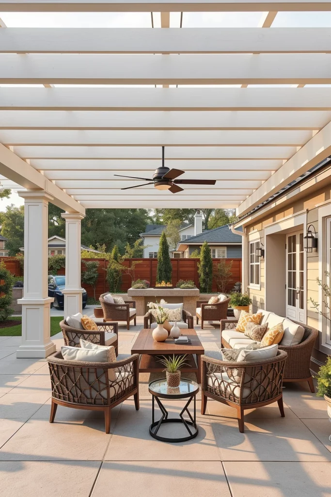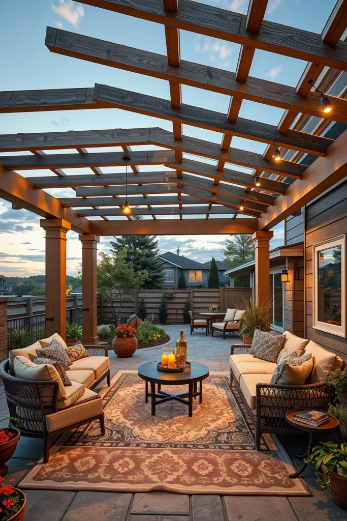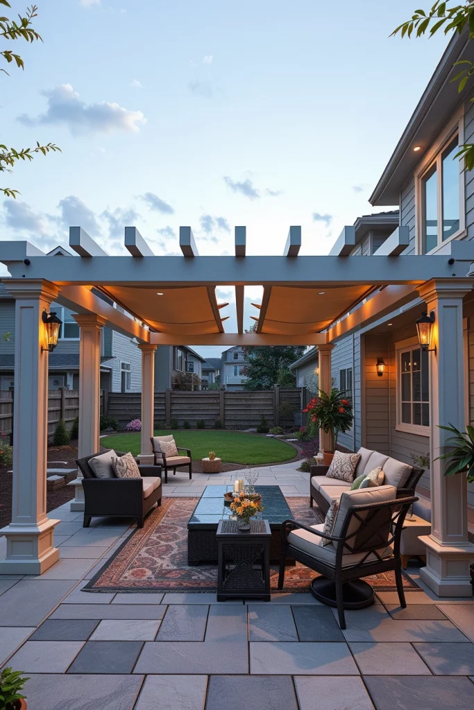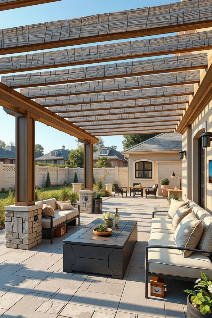 Furniture and accessories follow the same principle, with cohesive color coordination across seating, flooring, and structural elements. I recommend avoiding overly bold contrasts and instead layering subtle tones to create depth. This approach allows the pergola to age gracefully and remain visually relevant.