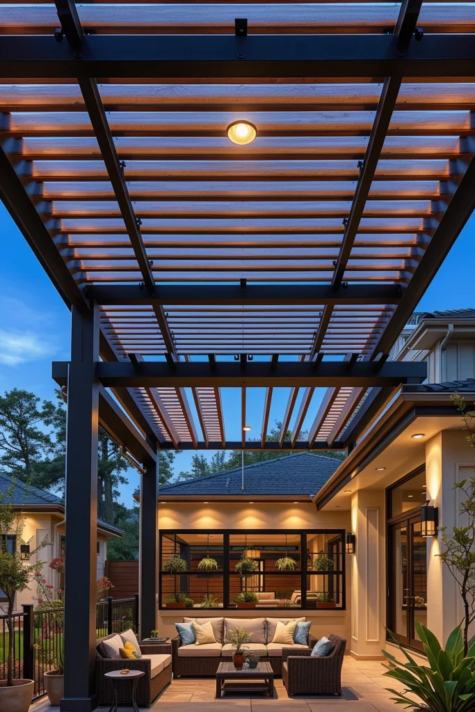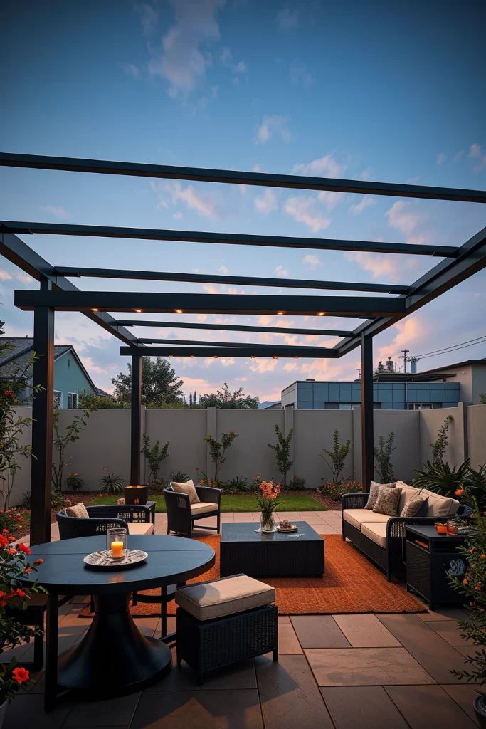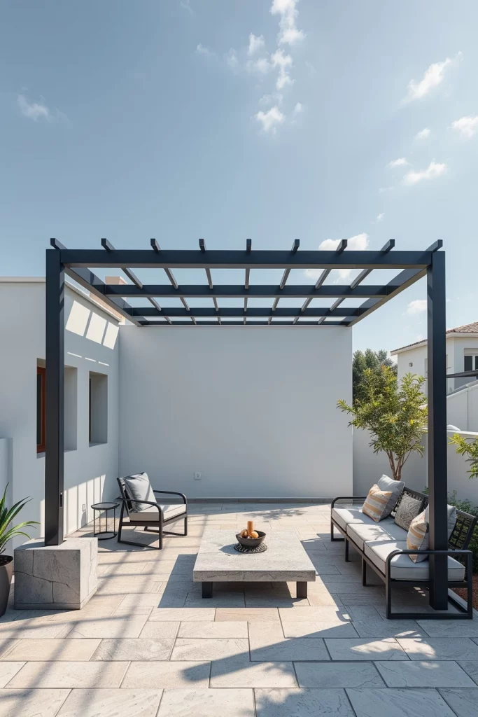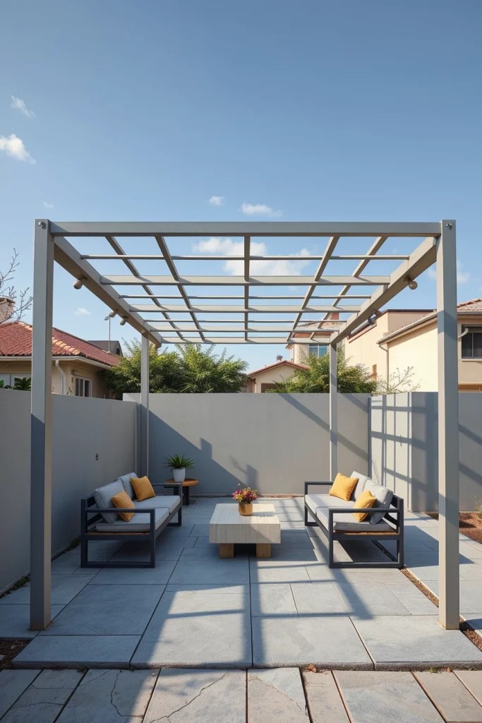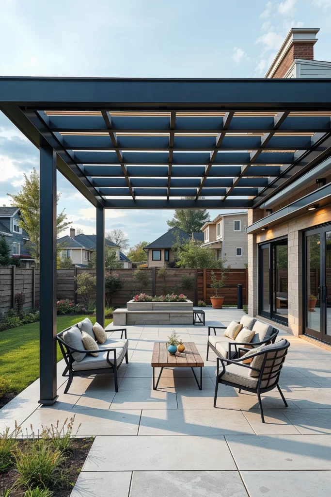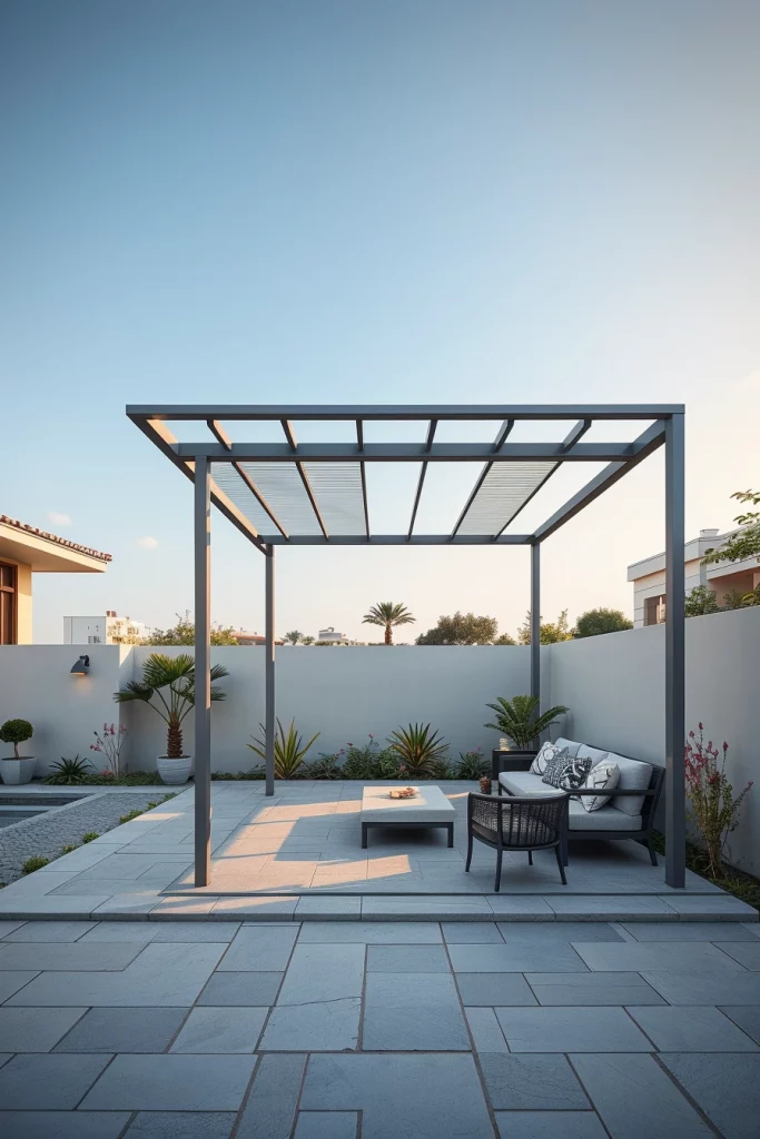 Metal structures play a major role in pergola ideas 2026, especially for contemporary and urban outdoor spaces. I favor metal pergolas for their precision, durability, and ability to create striking architectural silhouettes. These designs often feature sharp lines, flat profiles, and bold structural clarity.