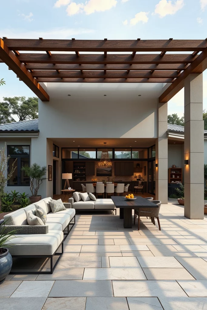 In my experience, the most effective open-air pergolas include modular seating, low-profile outdoor sofas, and integrated dining zones that mirror indoor layouts. Natural stone flooring or large-format porcelain tiles help visually extend interior flooring outdoors. Sliding glass walls or wide openings near the pergola strengthen the connection, making the space usable for daily living rather than just occasional gatherings.