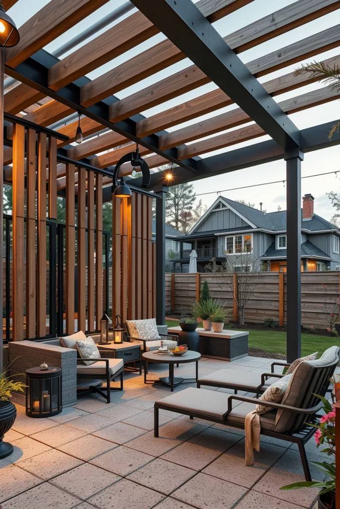 I typically recommend using a combination of wood slats, metal panels, or textured composite screens depending on the setting. Built-in benches, sectional seating, and compact outdoor coffee tables work well in these pergolas, creating intimate zones for conversation or relaxation. Screens can also serve as backdrops for soft lighting, enhancing atmosphere without visual clutter.