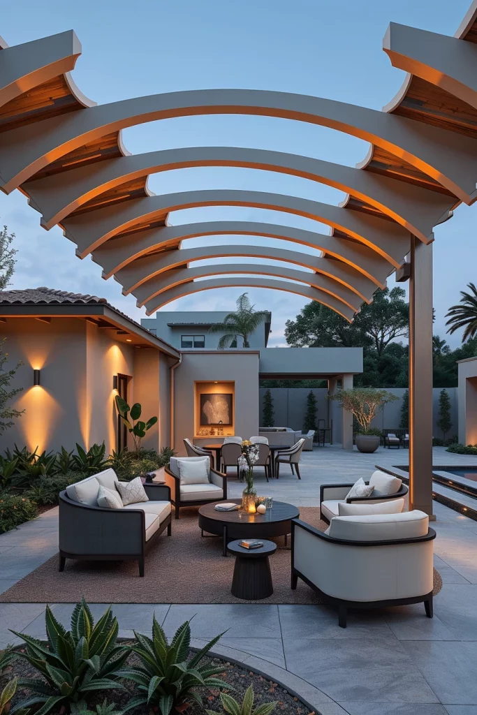 Sculptural pergolas represent a bold direction for 2026, where the structure itself becomes a visual focal point. I view these designs as outdoor installations that balance form and function, often featuring curved beams, asymmetrical frames, or custom steel or wood profiles that elevate the entire landscape.