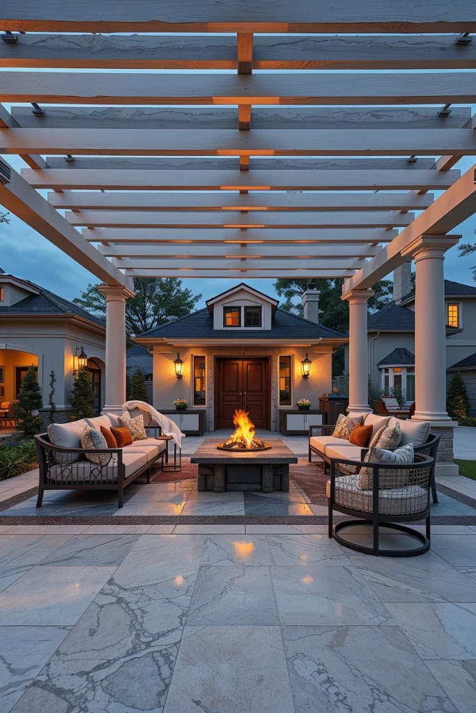 Luxury-focused pergola ideas 2026 elevate outdoor living to a resort-level experience. I design these pergolas as statement structures, often oversized and anchored by premium materials such as marble-look porcelain flooring or custom metal frameworks. These pergolas are meant to impress while remaining highly functional.