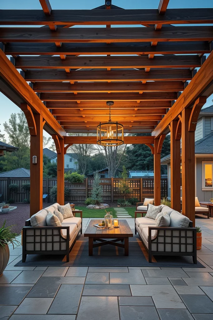In terms of furnishings, I recommend low-profile outdoor sofas, solid wood dining tables, and woven accent chairs that complement the pergola’s natural texture. Natural finishes such as matte sealants or light stains preserve the grain while protecting the wood from weather exposure. Stone or porcelain flooring works well to ground the space visually and functionally.