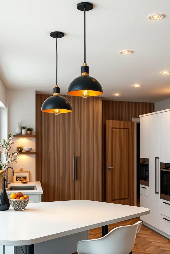 Personally, I like minimalist pendants usually made of black metal, matte brass or natural wood, on the basis of the room color scheme. They do better where they are low in the ground, and in groups of odd numbers–two or three on medium sized islands. To make it ultra-modern, you can think of sculptural figures, such as geometric cones or orb profiles.